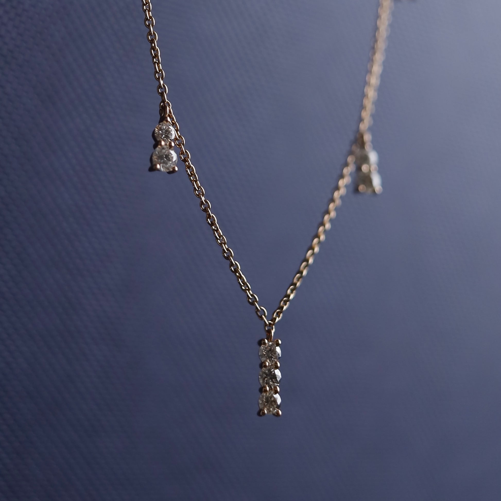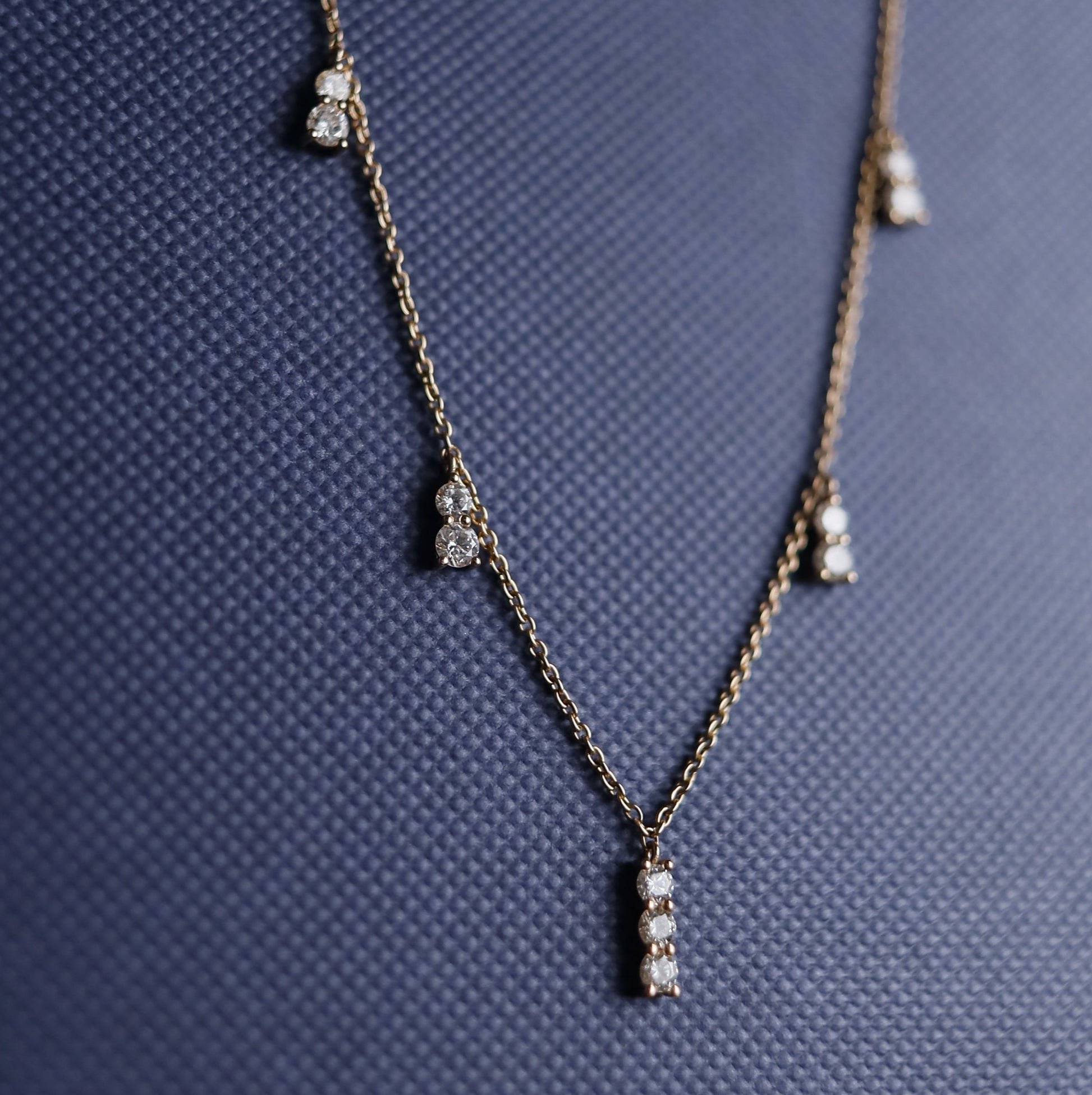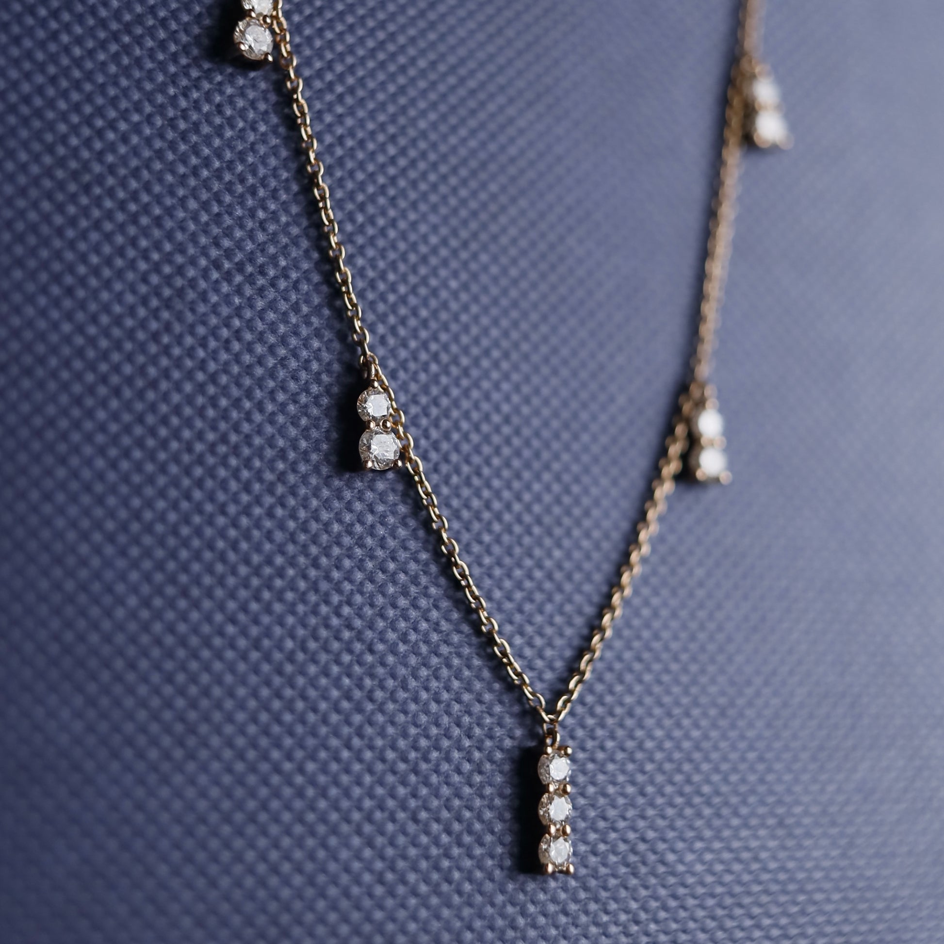 This necklace is made of 18KT gold and showcases 0.91 carats of diamonds with a VVS clarity rating. It is offered in both Rose and Yellow Gold options.